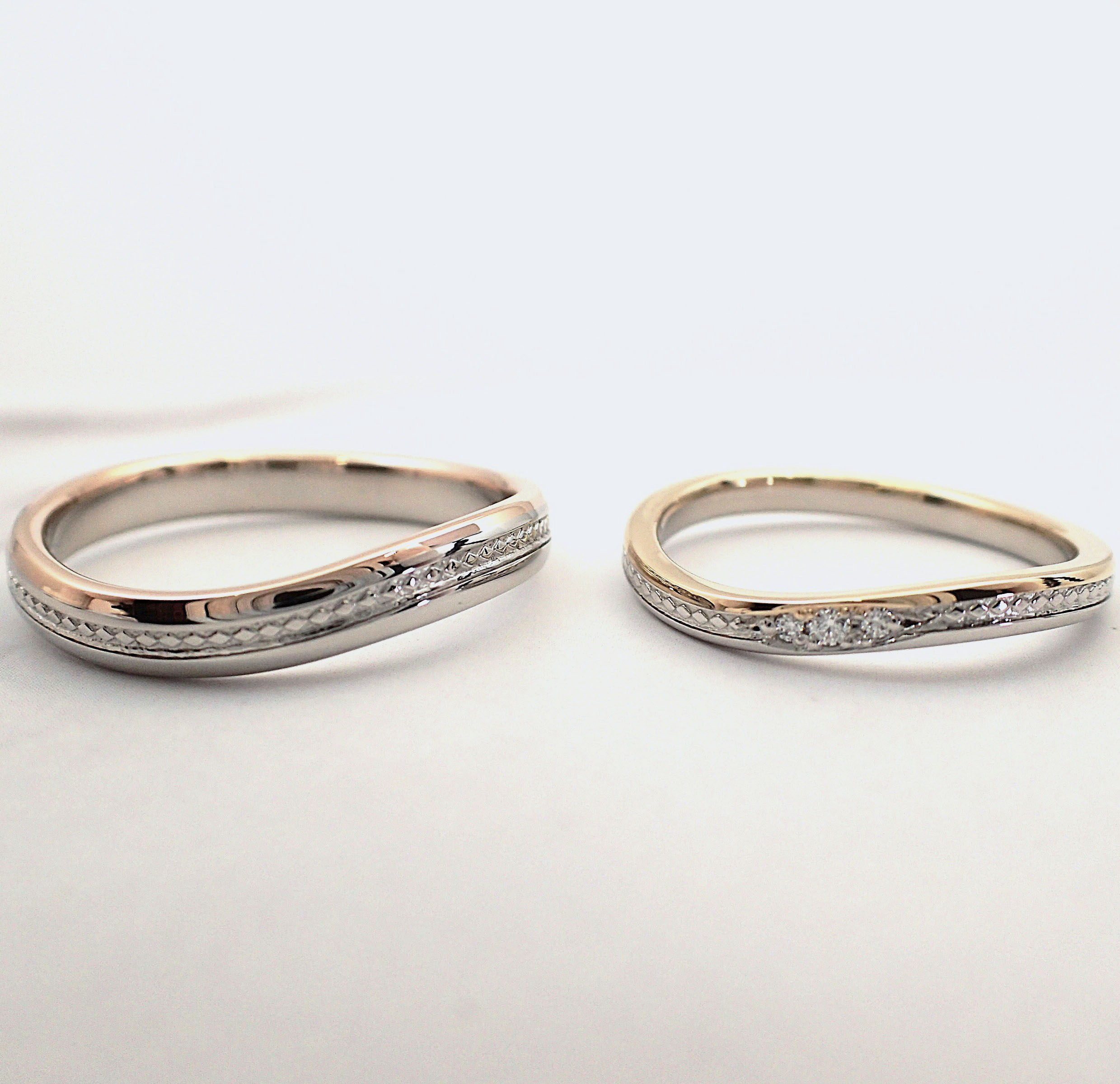 プラチナ素材は、純プラチナのPT1000。18金素材は、イエロー・ピンク・シャンパン・グリーンから選べ、コンビネーションも可能です。