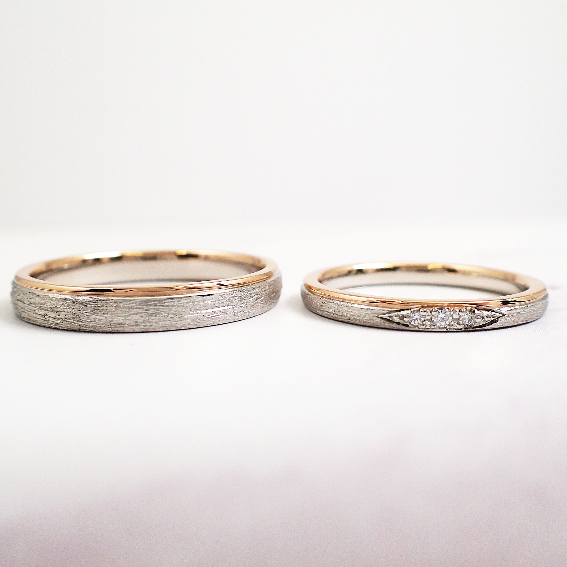 毎日つけながら、何十年もつけていたい。シンプルでありながら、地金純度やダイヤモンド4Cが高ければ、品格をまとい、実現できる。 生活とファッションになじむ美しいテクスチャー。指あたりがなめらかで優しい。コンビネーションの比率バランス。 プラチナ素材は、純プラチナのPT1000。18金素材は、イエロー・ピンク・シャンパン・グリーンから選べ、コンビネーションも可能です。 鍛造製法は、美しさだけでなく強度も高めています。 メレダイヤモンドは、GRUNBERGER DIAMONDSのF+VVS+ハート&キューピッドを使用し、引っ掛かりの少ない彫り留めを採用しています。 洗練された実物のリングをまずはお試し下さい。